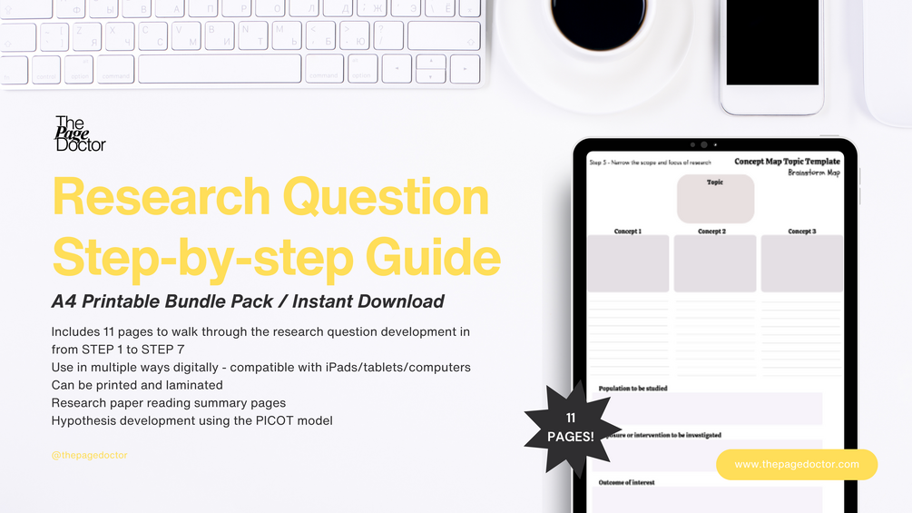 A complete 11-page printable research question development guide, including 7-steps from broad subject identification to narrowing the scope and focus of research